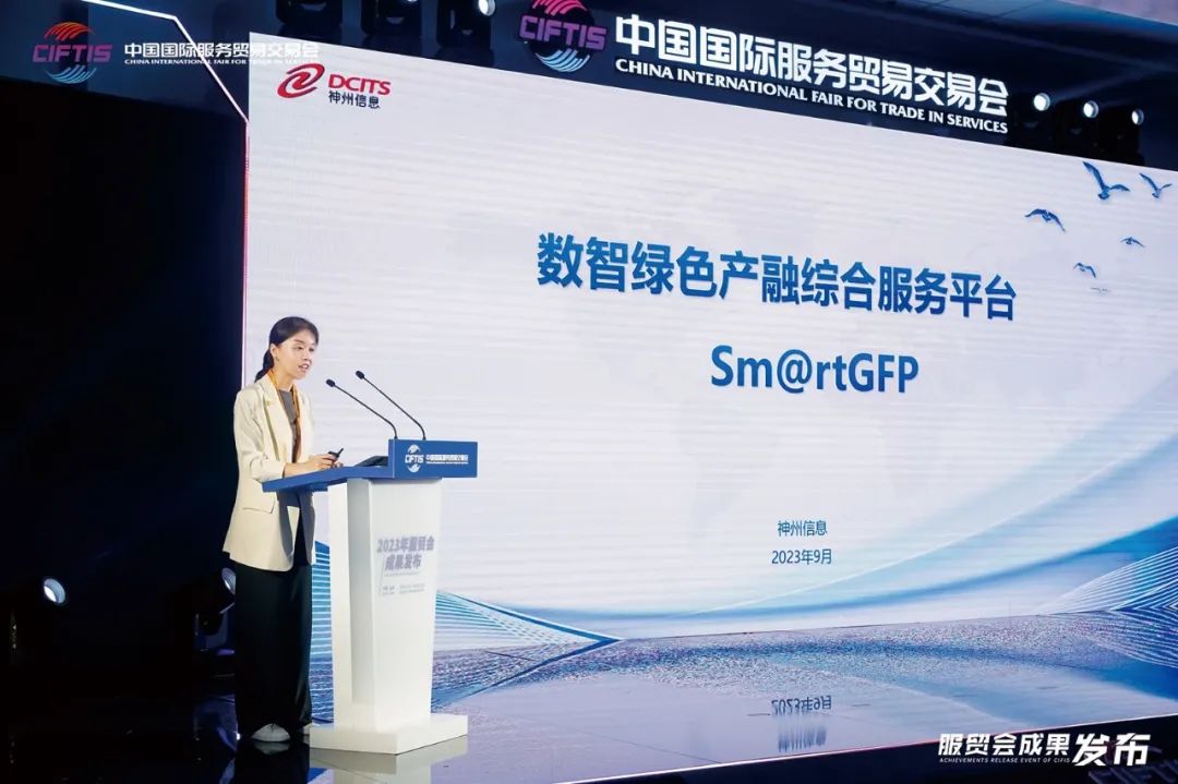 在9月6日举行的“服贸会成果发布”会上,神州信息新动力数字金融研究院业务创新部总经理陈洁,重磅发布了神州信息新产品——数智绿色产融综合服务平台Sm@rtGFP。